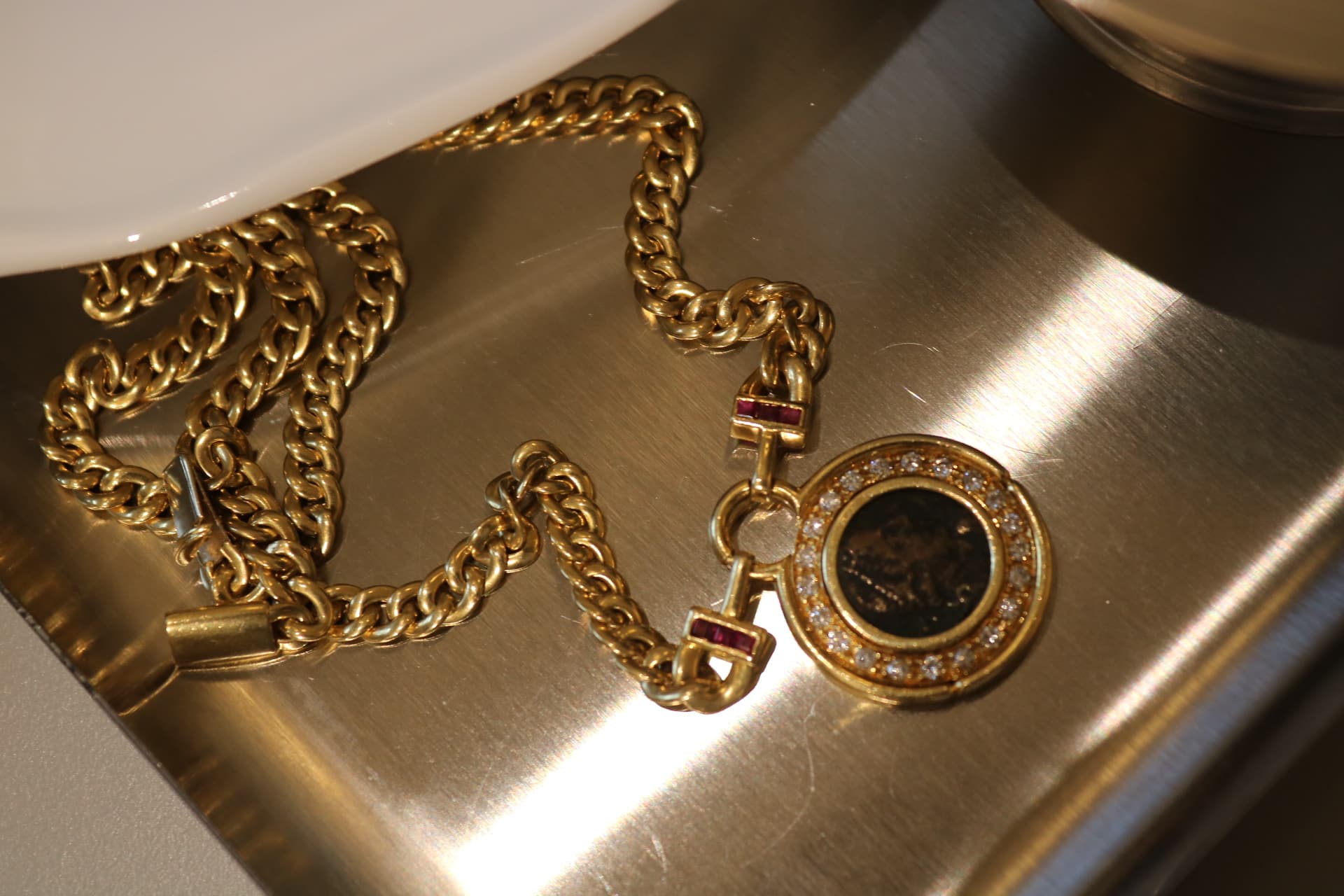 Mål: Kæde Længde: 40,5 cm – Kæde Bredde: 0,5 cm – Vedhæng diameter: 2,3 cm